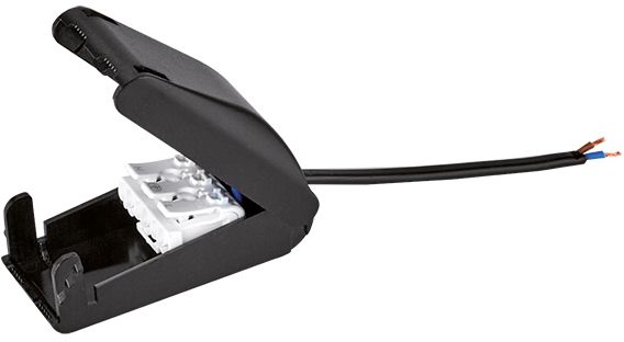 Anschlussbox 230 V AC, 3-polig (schaltbar / Phasenabschnitt), schwarz. 3-polige Anschlussbox mit 100 mm Anschlussleitung, Material: Kunststoff Die Eingangsklemme ist für Leitungen mit einem Querschnitt von 0,5 bis 2,5 mm² geeignet. Material: Kunststoff, Schutzart raumseitig: nach DIN EN 60529: IP20, Spannung: 230V.