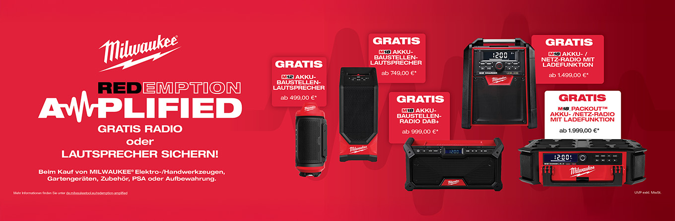 Sichere Dir jetzt Dein Gratis-Radio/ -Speaker beim Kauf aus dem MILWAUKEE-Sortiment. So einfach geht's: