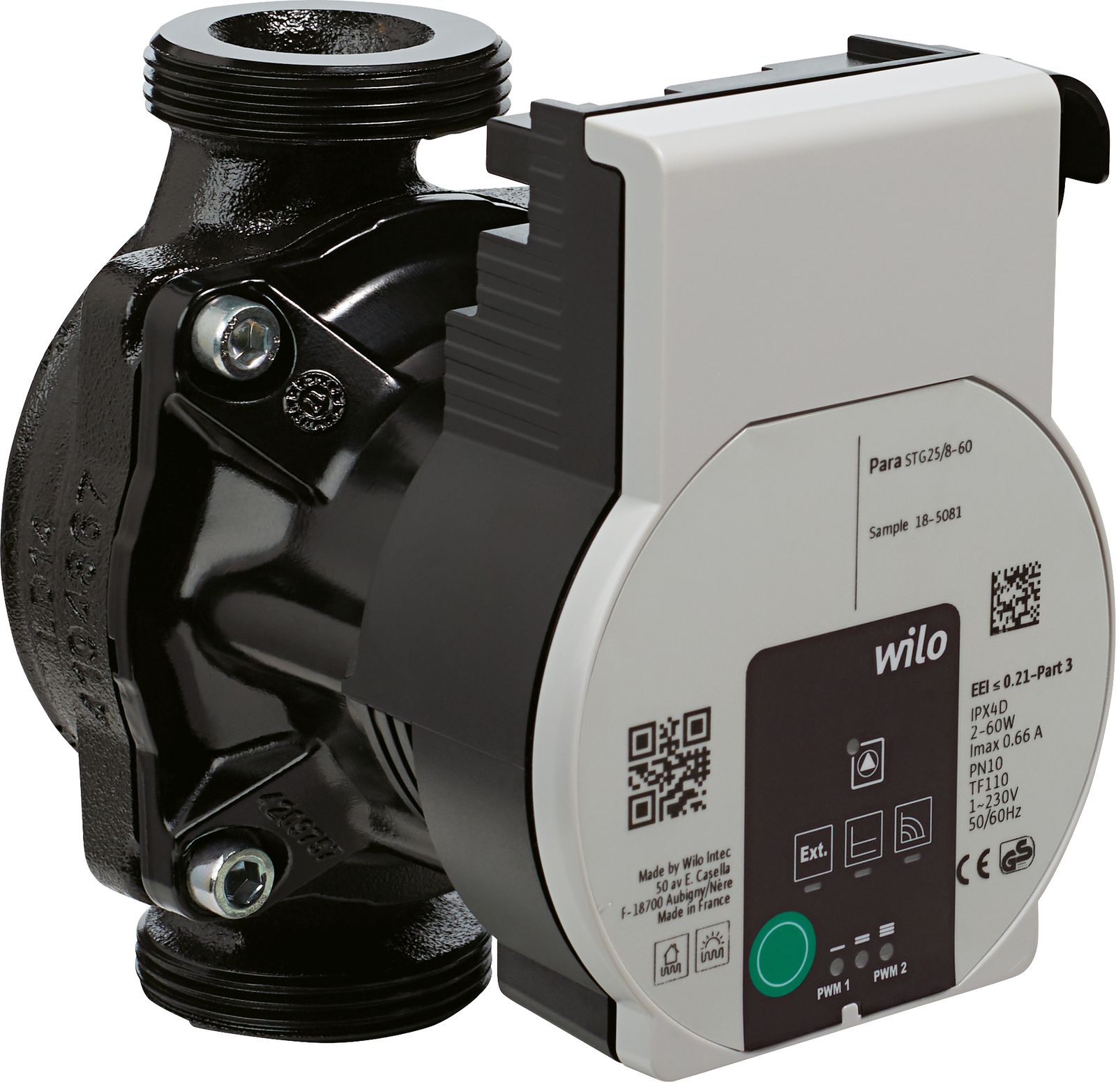 Pumpenbaugruppe für einen ungemischten Heizkreis, Vorlaufseite rechts. Zum Lieferumfang gehören die eingebaute Hocheffizienz-Heizungsumwälzpumpe, Absperrventile mit Thermometer und Schwerkraftbremse inklusive Öffnungsvorrichtung sowie die EPP-Fertigisolierung mit Wandhalterung und Blende. Die Pumpenbaugruppe kann sowohl am Pufferspeicher als auch an der Wand installiert werden.