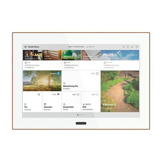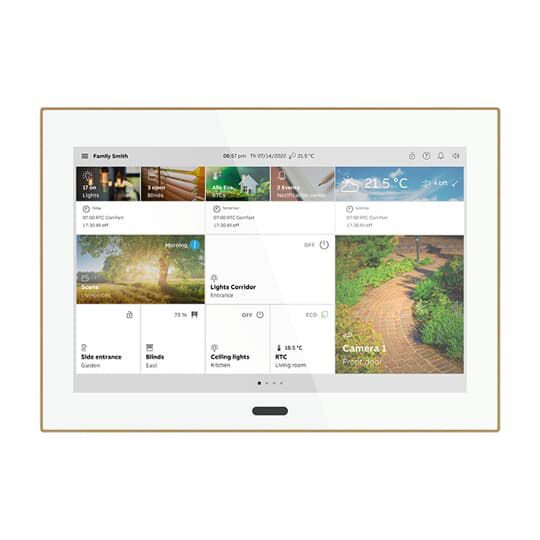 Frei konfigurierbares 10-Zoll Touchpanel, das intelligente Hausautomation und Türkommunikation in einem Gerät für Wohnanwendungen, Hotels und gewerbliche Gebäude vereint. Das SmartTouch 10 bietet die Steuerung und Überwachung des Busch-free@home - oder KNX-Systems sowie die vollständige Integration von Busch-Welcome . Steuern, beobachten und verwalten Sie Ihre gesamte Anlage mit einem Gerät: Schalten, Dimmen, Jalousiesteuerung sowie verschiedene Steuerelemente für RGBW-Farbsteuerung, HLK-Anwendungen und Audio-Bedienung. Mit Szenen- und Logikfunktionen, Anwesenheitssimulation und Zeitprogrammen. Das Display kann zusätzlich als 2-Draht-Innenstation für Busch-Welcome fungieren. Funktionen KNX: Insgesamt werden 450 Bedienelemente auf maximal 25 Seiten dargestellt. 80 Fehler- und Alarmmeldungen. 30 logische Funktionen. 40 Timer. Anwesenheitssimulation für 20 Teilnehmer. 10 Szenenaktoren. 3 Objekt RTR. Seitendarstellung mit maximal 18 Touchflächen auf einer Seite. Funktionen Busch-free@home : Die TP-Verbindung bietet maximal 18 Bedienelementen auf einer einzigen Seite. Alternativ kann über WLAN der gleiche Umfang an Funktionen hergestellt werden wie in der Busch-free@home Next App. Funktionen Busch-Welcome : Darstellung des Videobildes der Außenstation. Bei Türrufen in Abwesenheit werden automatisch drei Bilder des Besuchers gespeichert. Zusätzlich kann während des Gesprächs ein Bild des Besuchers aufgenommen werden. Unterschiedliche Klingeltöne für Tür- und Etagenruf einstellbar, fünf polyphone Klingeltöne stehen zur Auswahl. Lautstärke der Klingeltöne einstellbar. Ausgestattet mit einer Hörschleife zur Einkopplung des Audiosignals in Hörgeräte. Mit Freisprechfunktion, Freisprechlautstärke einstellbar. Möglichkeit zur Integration von ONVIF-IP-Kameras. Mobile Innenstelle für Audio- und Videokommunikation über mobiles Endgerät mit installierter Busch-free@home Next APP oder Busch-Welcome App. Es können jeweils bis zu 10 mobile Endgeräte verknüpft werden. Bitte beachten Sie hierzu unser my.Busch-Jaeger Lizenzmodell. Nähere Informationen erhalten Sie unter my.busch-jaeger.de. Externe Stromversorgung: 20-32 V DC (SELV) oder über die Busch-Welcome Systemzentrale (Verbrauchseinheiten: 14). Display-Auflösung: 1280*800. Bildschirm: IPS-Bildschirm. Unterputzmontage mit der Unterputzdose. Aufputz- oder Tischmontage mit Aufputz-Rahmen oder Tischständer. Der schlanke Echtmetallrahmen in flachem Design schließt fast bündig mit der Wand ab (14 mm). Produktreihe: Busch-free@home ,