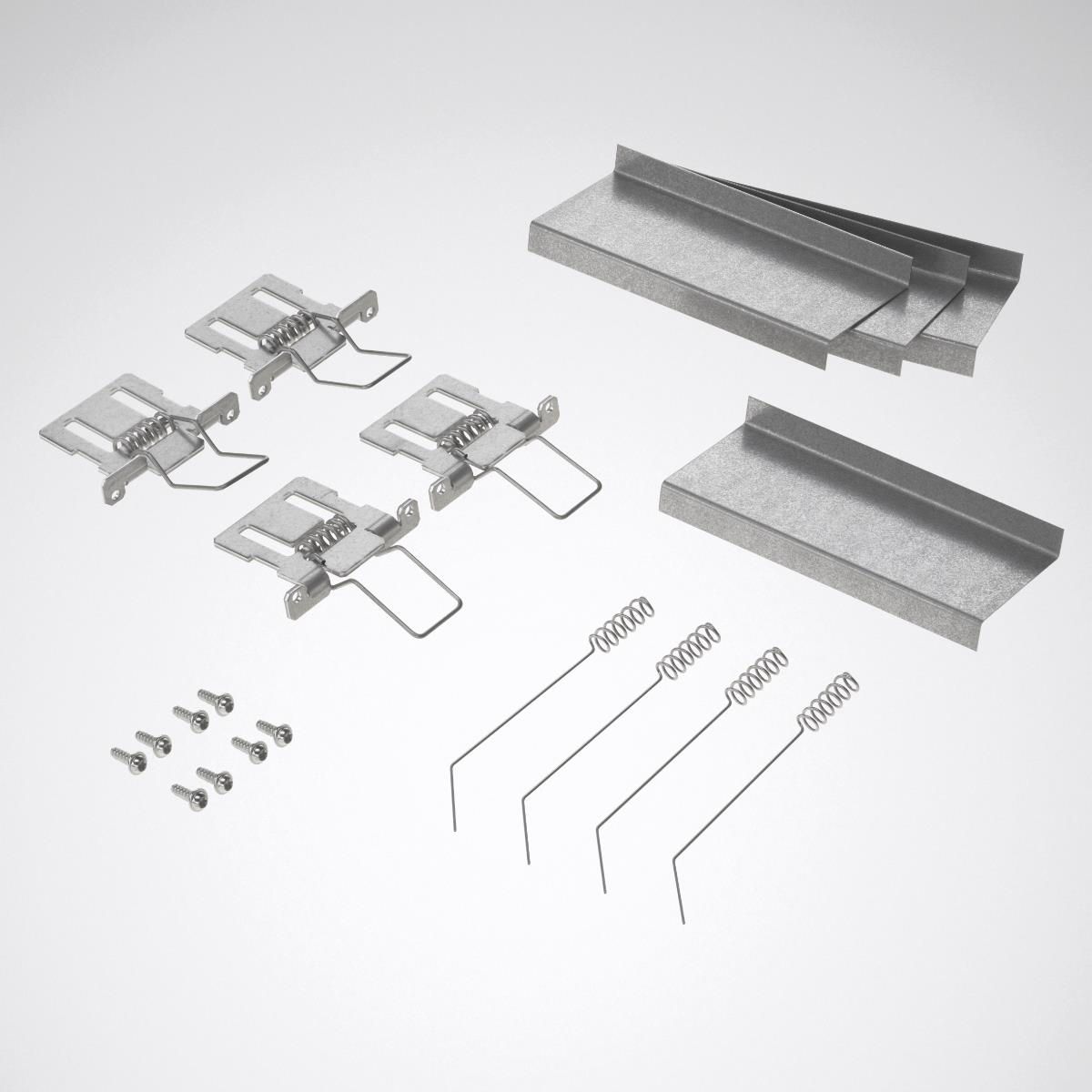 Schnellmontage-Schwenkbügel (4 Stück), verzinkt, zur Befestigung von Einbauleuchten (Creavo M17/M19/M37/M39 oder Opendo M36/M37/M38/M39) in Decken mit verdeckten Tragschienen und gesägte Decken. Maß zwischen Unterkante Deckenplatte und Oberkante Tragschiene max. 56 mm, Tragschienenhöhe min. 18 mm.