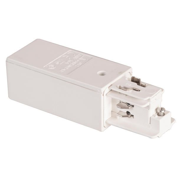 Zumtobel 3-Phasen-Anfangseinspeisung, Schutzleiter rechts oder links Polarisierungsnase links Kunststoffteile aus Polycarbonat Leitungseinführung stirnseitig und von Seite des Schienenrückens maximale Strombelastung: 16A pro Phase Einbauabmessungen: 68 x 34 x 34 mm, Gesamtabmessungen: 110 x 34 x 34 mm.