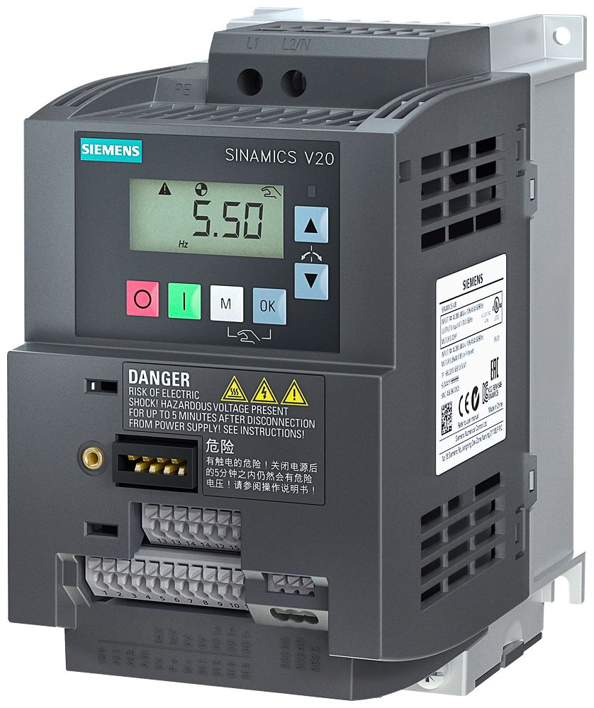 SINAMICS V20 1AC 200-240 V -15/+10 % 47-63 Hz 3 kW mit 150 % Überlast für 60 s integrierter Filter C1 E/A: 4 DI, 2 DQ, 2 AI, 1 AO Feldbus: USS/Modbus mit eingebautem BOP Schutz IP20/UL ungekapselt Größe: AD 136x176,5x160(BxHxT) Frequenzumrichter SINAMICS V20. Einfach. Robust. Effizient. Für industrielle Applikationen und gewerbliche Anwendungen im Spannungsbereich 1AC 200 V bis 240 V. SINAMICS V20 zeichnet sich durch kurze Inbetriebnahmezeiten, einfache Bedienung, Robustheit und Kosteneffizienz aus. Der Umrichter kann ohne zusätzliche Module direkt aus der Verpackung betrieben werden. Zur Steigerung der Energieeffizienz ist der Umrichter mit einem energieoptimalen Steuerungsverfahren mit automatischer Flussabsenkung ausgerüstet. Er stellt zudem den aktuellen Energieverbrauch dar und verfügt über weitere integrierte Energiesparfunktionen. Der Keep-Running-Modus ermöglicht einen stabilen Betrieb auch bei schwierigen und schwankenden Netzbedingungen. Der Umrichter ist in neun Baugrößen in einem Leistungsbereich von 0,12 kW bis 30 kW für den Betrieb an ein- und dreiphasigen Netzen (1AC 200 V bis 240 V, 3AC 380 V bis 480 V) verfügbar. Der SINAMICS V20 kann mittels verschiedener Optionen, wie lokale Bedieneinheit Basic Operator Panel (BOP) oder mobile Bedieneinheit SINAMICS V20 Smart Access Module, BOP-Interface, Standard-Netzwerkkabel, Netzfilter, Bremswiderstände, Schirmung, etc. individuell den Anforderungen der Applikation angepasst werden. Zudem ermöglicht er die einfache Systemkonfiguration mit vordefinierten Makros im Umrichter und vorgefertigten Funktionsblöcken aus dem Totally Integrated Automation Portal (TIA-Portal) für den schnellen Anschluss z.B. an eine SIMATIC-S7-1200 Steuerung. Der Basisumrichter SINAMICS V20 ist eine technische und wirtschaftliche Alternative für den Micromaster 420 Frequenzumrichter. SINAMICS - einfach