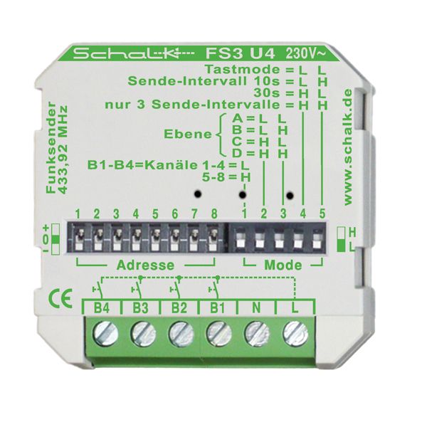 Der Funk-Empfängerschalter FE3 D2 besitzt zwei potentialfreie Schließerkontakte, die über Hand- oder Einbausender der FS3-Serie drahtlos geschaltet werden können. Die 3 Funktionen (undefinedEin/Aus, undefinedEin, undefinedAus) können einer beliebigen Sendertaste oder einem bedrahteten Tastereingang B1/B2 zugewiesen werden. Die Funktion undefinedEin/Aus (abwechselnd Ein-Aus über eine Taste) dient zur Einzelsteuerung. Über die dezidierten Funktionen undefinedEin und undefinedAus können auch mehrere Empfänger gemeinsam geschaltet werden (z.B. für Gruppen- oder Zentralsteuerungen). Das Relais kann im Schalt- oder Tastmodus (mit oder ohne Zeitablauf) betrieben werden. Zusätzlich verfügt der Empfänger über spezielle Motorbetriebsarten (Rollladen, Jalousien, Tore etc.), bei welchen die Relais automatisch gegeneinander verriegelt sind., Kompatible Produkte: Funksender FS3-Serie, Repeater FV2 R., Maße: 43x43x18.5mm, 230V AC, 2 Schließer 10A, potentialfrei, 2 Vororteingänge,