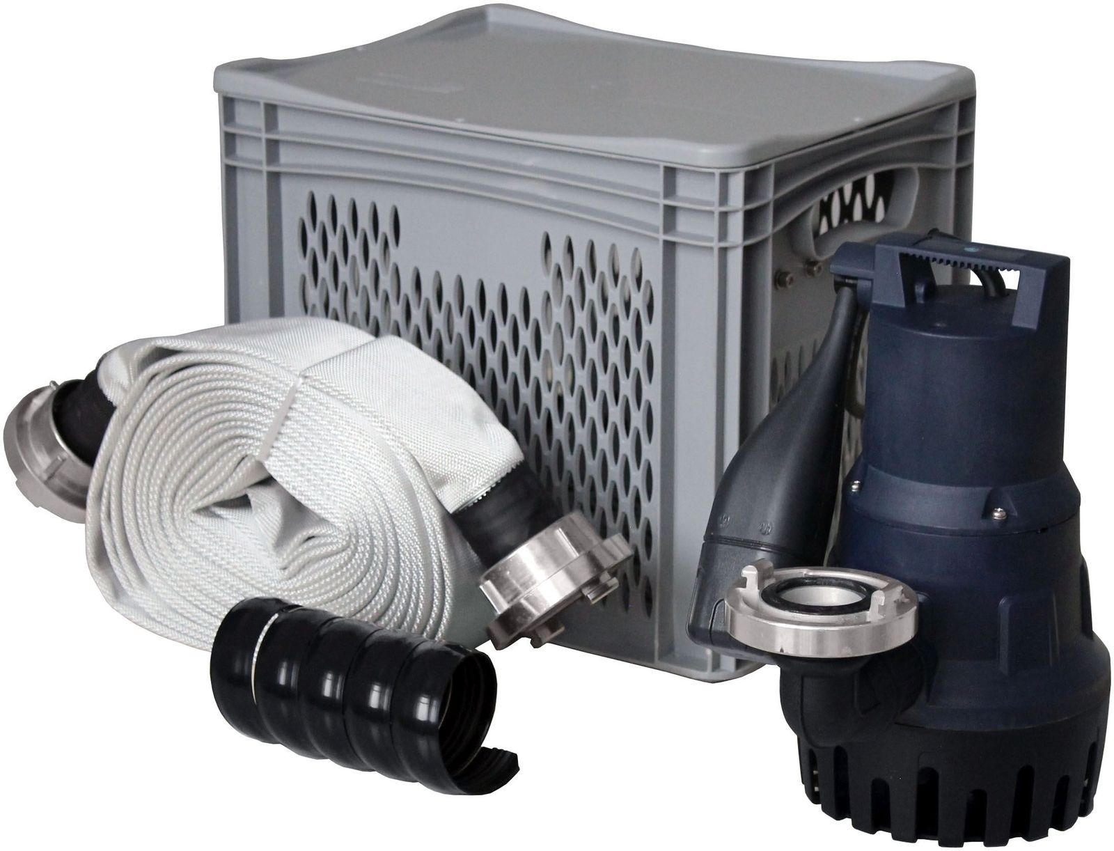 mit leistungsstarker Kellerentwässerungspumpe U5KS, Pumpe mit Motormantelkühlung für aufgetauchten Betrieb, schneller, einfacher Schlauchanschluss durch C-Kupplung, Schwimmerarretierung für Dauerbetrieb, Wandaufhängung für Lagerung, bestehend aus 1x Kellerentwässerungspumpe U5KS, 1x Feuerwehrschlauch 12,5 m mit C-Kupplung (C52), 1x Tragekorb mit integrierter Pumpenfixierung, 1x Schwimmerarretierung, mit Schaltautomatik, Netzleitung 10 m H07RN-F