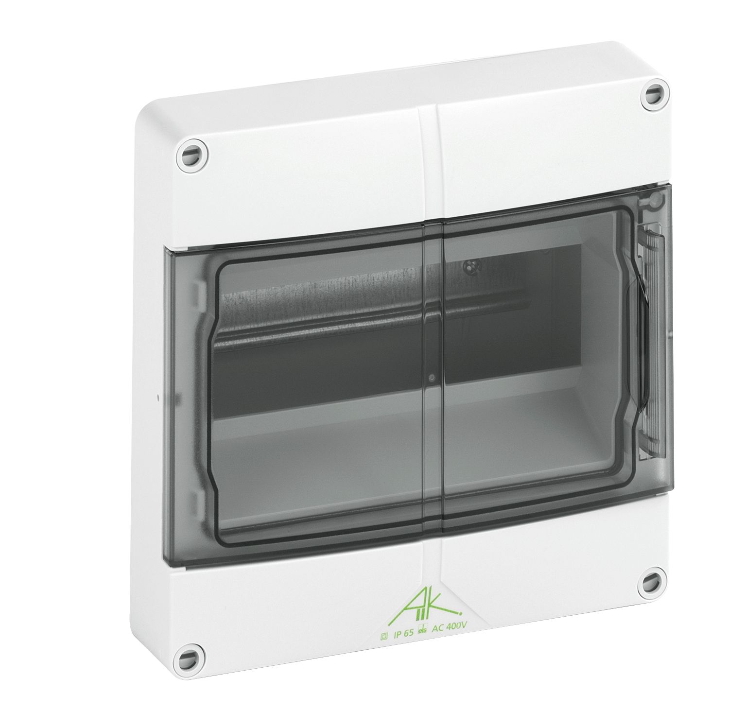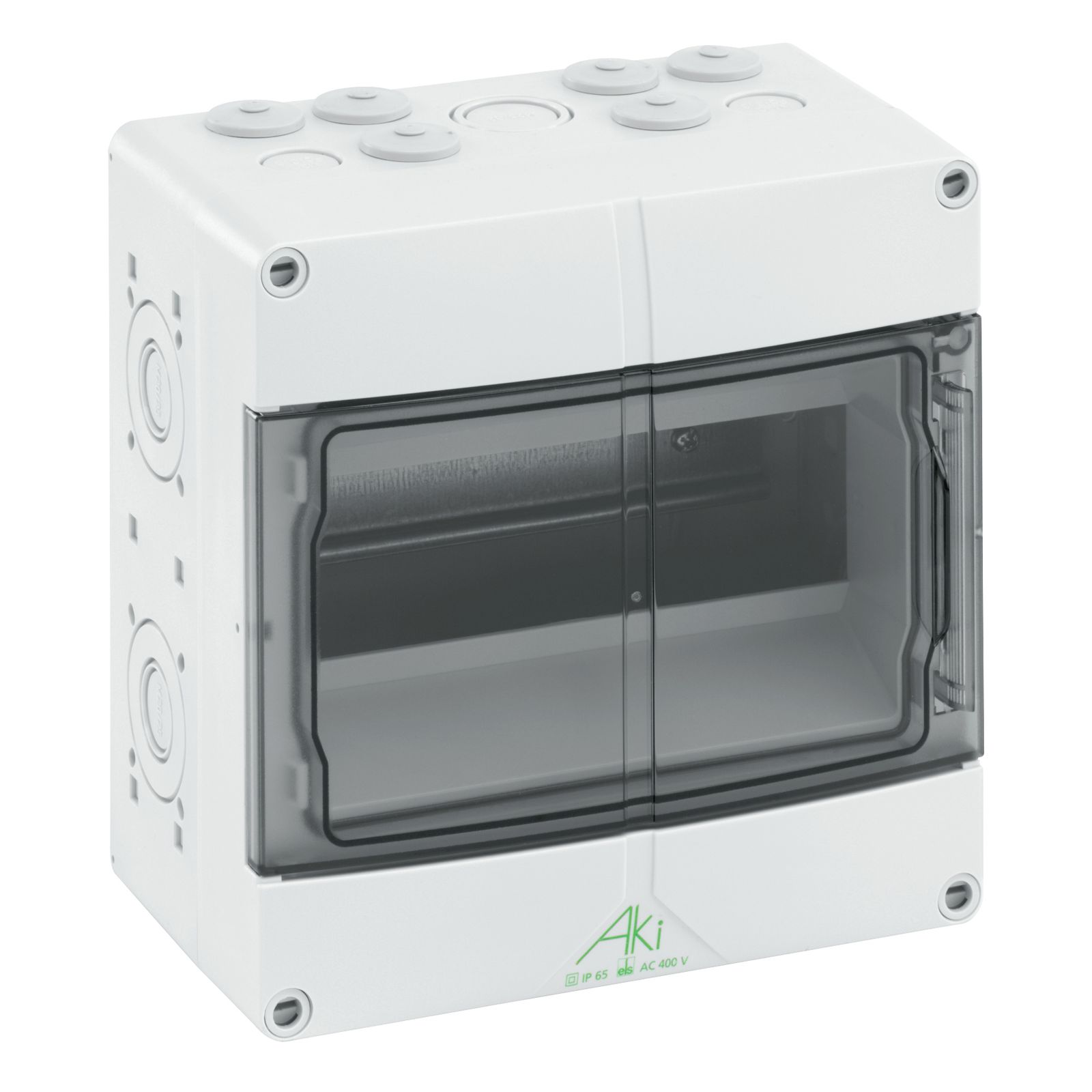 Kleinverteiler, mit Schutzart IP65, 1-reihig, 9 verfügbare Teilungseinheiten, Bemessungsbetriebsspannung: 400V AC, Bemessungsisolationsspannung: 1000V AC, 1000V DC, oben und unten metrische Vorprägungen für universelle Leitungseinführungen mit Kabelverschraubungen und / oder Doppelmembranstutzen, oben mit elastischen Einführungen DMS M20 vorbestückt, für die Standardinstallation im Innenbereich, mit PE/N-Klemmschiene mit jeweils 2 Klemmstellen 16mm² und 5 Klemmstellen 6mm² Abmessungen: 200 x 200 x 122mm Beigefügtes Zubehör: Doppelmembranstutzen: 1x M20, 1x M32, Verschlussstopfen, Abdeck- und Beschriftungsstreifen