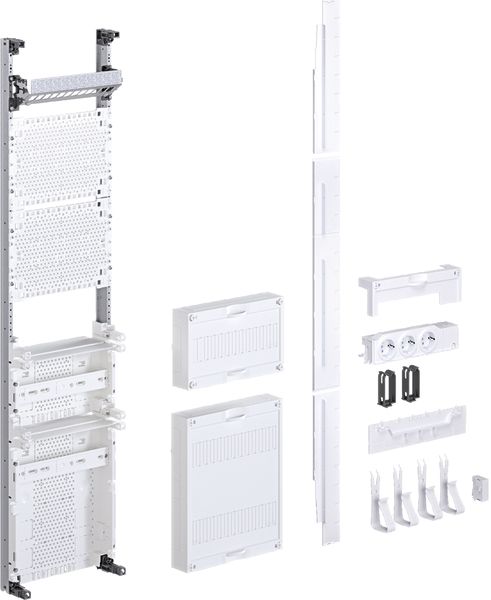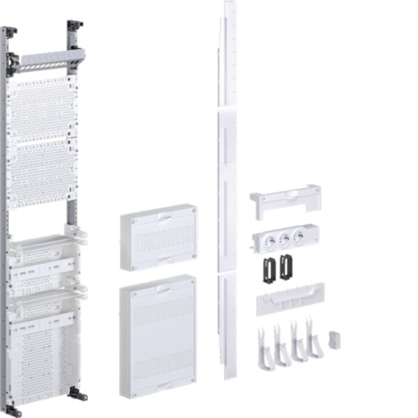 Einbausatz,univ.Z,H=1350mm,für LM-Anwendungen,APZ 300mm,RfZ 150mm,MM 900mm, 1-f..Einbausatz für Lastmanagement Anwendungen zum Einbau in Zählerschranksystem durch werkzeuglose Schnellmontage nach Norm DIN VDE 0603. Vormontierter Einbausatz bestehend aus Traggerüst mit Tragschienen, Patchpanel und gelochten Kunststoff-Montageplatten für den Multimediabereich, Zusatzraum für Lastmanager (RfL) sowie Anschlusspunk Zählerplatz (APZ). Der APZ (HxB = 300x250 mm) zur Gerätekomponenten-Montage für die APZ-Anwendung ist als vollständiges Kunststoffgehäuse mit seitlichen Leitungseinführungen im plombierten Bereich aufgebaut. Beigelegt sind: Universalhaltebügel mit schraubloser Befestigung von Gerätekomponenten direkt auf dem Lochblech, Berührungsschutzabdeckungen aus Kunststoff mit Vierpunkt-Befestigung (serienmäßig plombierbar) und integriertet Griff. Der RfL (HxB = 150x250 mm) ist als vollständiges Kunststoffgehäuse aufgebaut. Zur Montage des Lastmanagers (Reiheneinbaugerät, nicht enthalten) ist eine Kunststoff-Hutschiene integriert. Der Multimedia-Bereich zur Montage der Multimedia-Komponenten für die Lastmanagement-Anwendung. Bestehend aus einem isoliertem vormontiertem Patchpanel für 12-Ports mit Bezeichnungsstreifen, 6 geschirmten Datenmodulen RJ45 Kat. 6 (500 MHz), 3-fach Schutzkontaktsteckdosen (90 Grad drehbar) zum Leitungsanschluss über Steckklemmen, Multimedia-Gerätehalter für VDI-Komponenten und Kabel- Halteklammern. Hinweis: Vom Patchpanel ist eine Leitung zur Potentialausgleichsschiene (Funktionspotentialausgleich nach DIN EN 50310 - VDE 0800-2-310) miteinander zu verbinden (nicht enthalten). Abschottungen vom Multimediafeld neben anderen Einbausätzen sind nach Anwendung