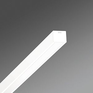 Stahlblechgehäuse im Quadratdesign, vorbereitet zum Befestigen von Stirnseiten oder Leuchtenverbindern aus Stahl, Lichtverteilung direkt strahlend mittels Diffusor satiniert aus Polycarbonatprofil, Entblendung durch diffus strahlendes, satiniertes PC-Profil, bei Lichtbandmontage Diffusor optisch durchlaufend. Elektrischer Anschluss über 3-polige Anschlussklemme in Steckkontakt-Technik.