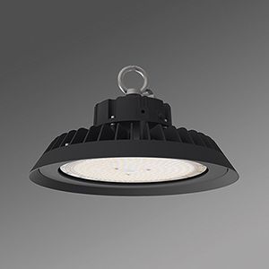 Gehäuse aus Aluminiumdruckguss, schwarz gepulvert, Gehäuserückseite mit integrierter Ringschraube für Pendel-Abhängung. Lichtverteilung direkt tiefstrahlend mittels LED-Linsenoptik, mit transparenter Abdeckung aus PC. Elektrischer Anschluss über 0,3m lange Anschlussleitungen 3x1,0mm².