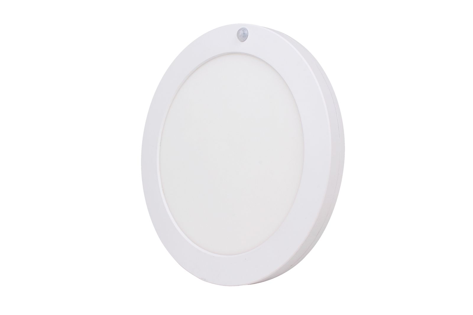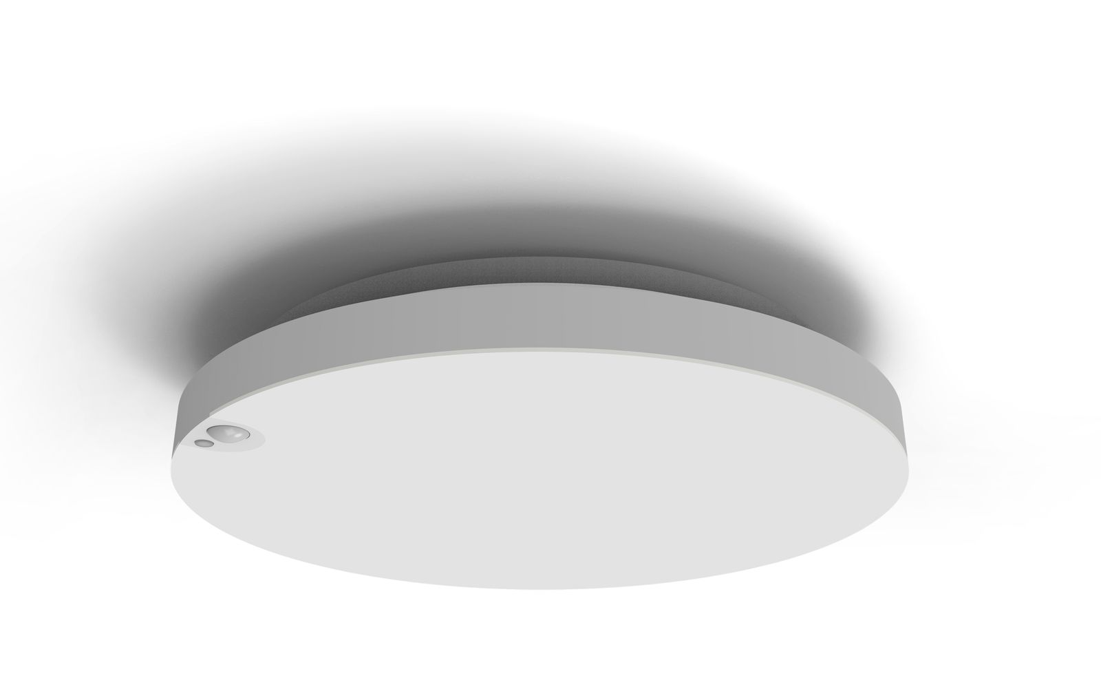 Runde Aufbau-Leuchte zur Deckenmontage, Gehäuse aus Polycarbonat, Farbe weiß, RAL 9016, opale Abdeckung, verschiedene Farbtemperaturen einstellbar, mit Infrarot-Bewegungsensor