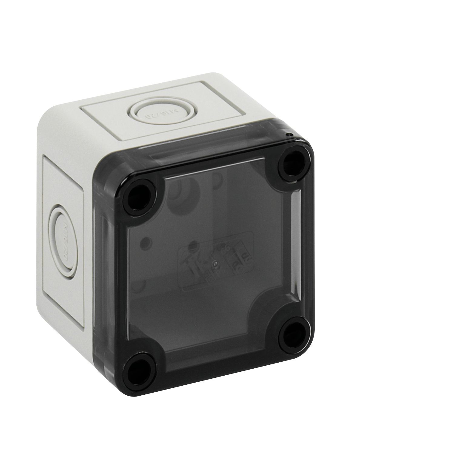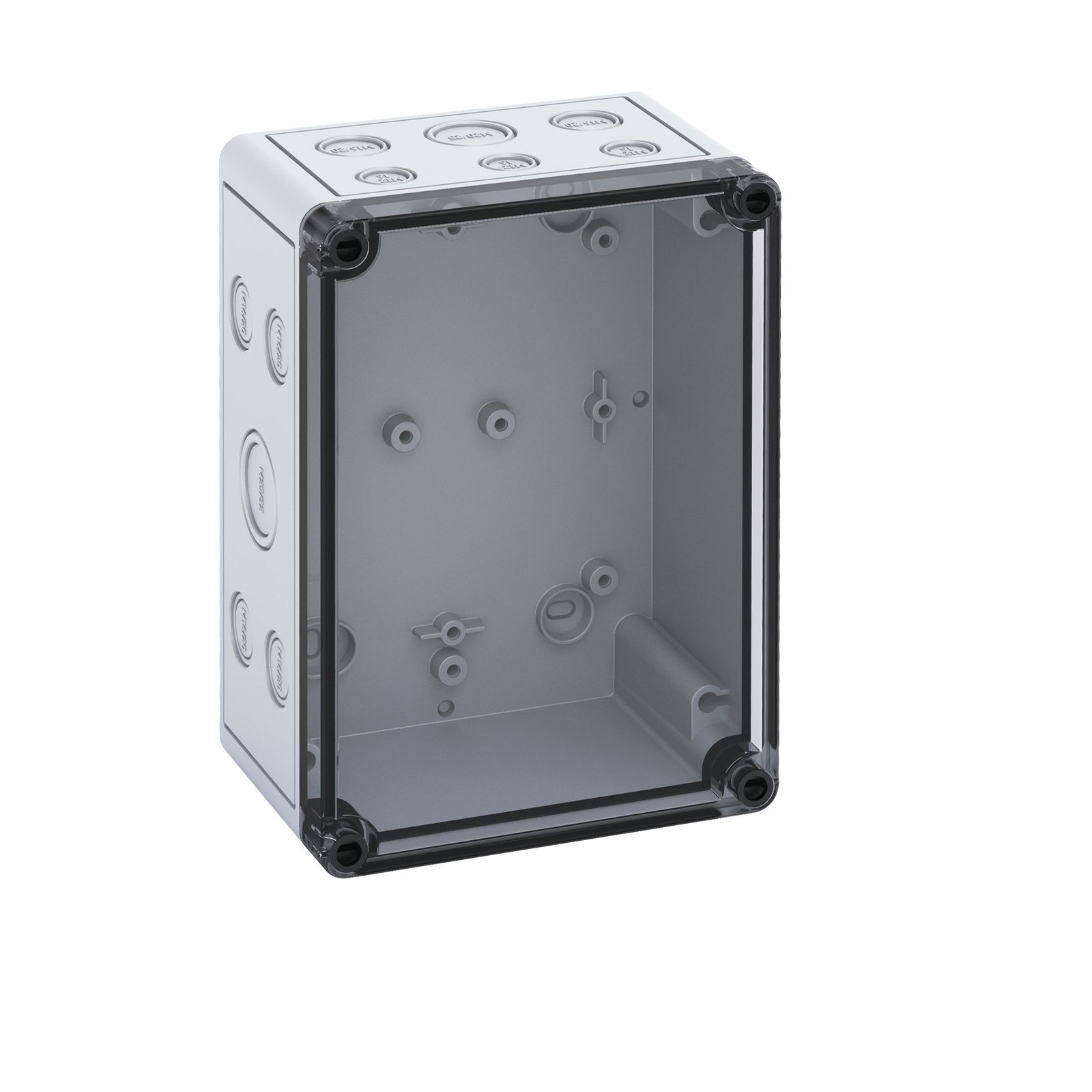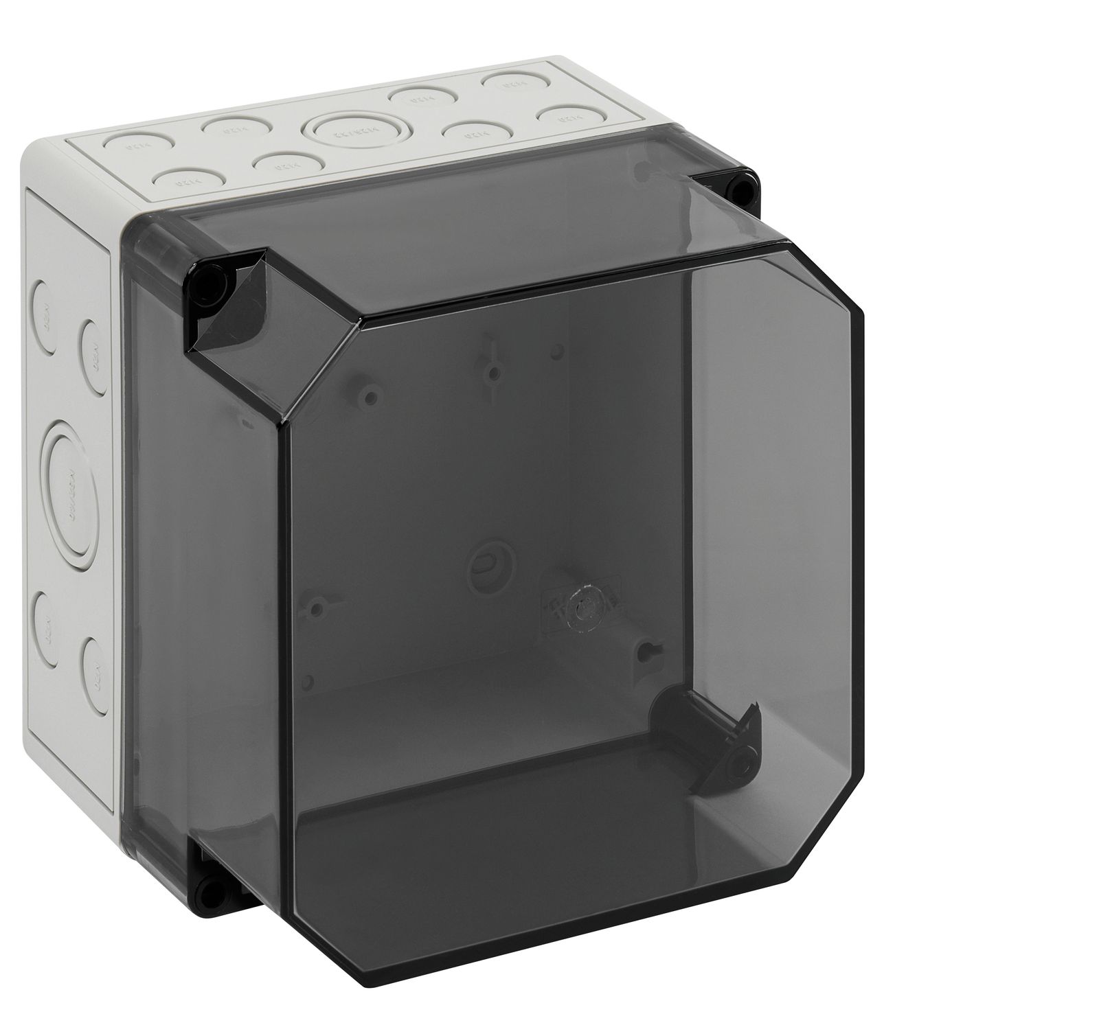Leergehäuse, mit Schutzart IP66, Polystyrol, Ui=690V AC, Ui=1000V DC, innenliegende Befestigungsstellen, für Standardinstallationen im Innenbereich, Kasten: Polystyrol, grau, Deckel: Polycarbonat, transparent, Ausschlagmembranen, M20/M25/M32/M40, (32 seitlich) Abmessungen: 254 x 180 x 165mm