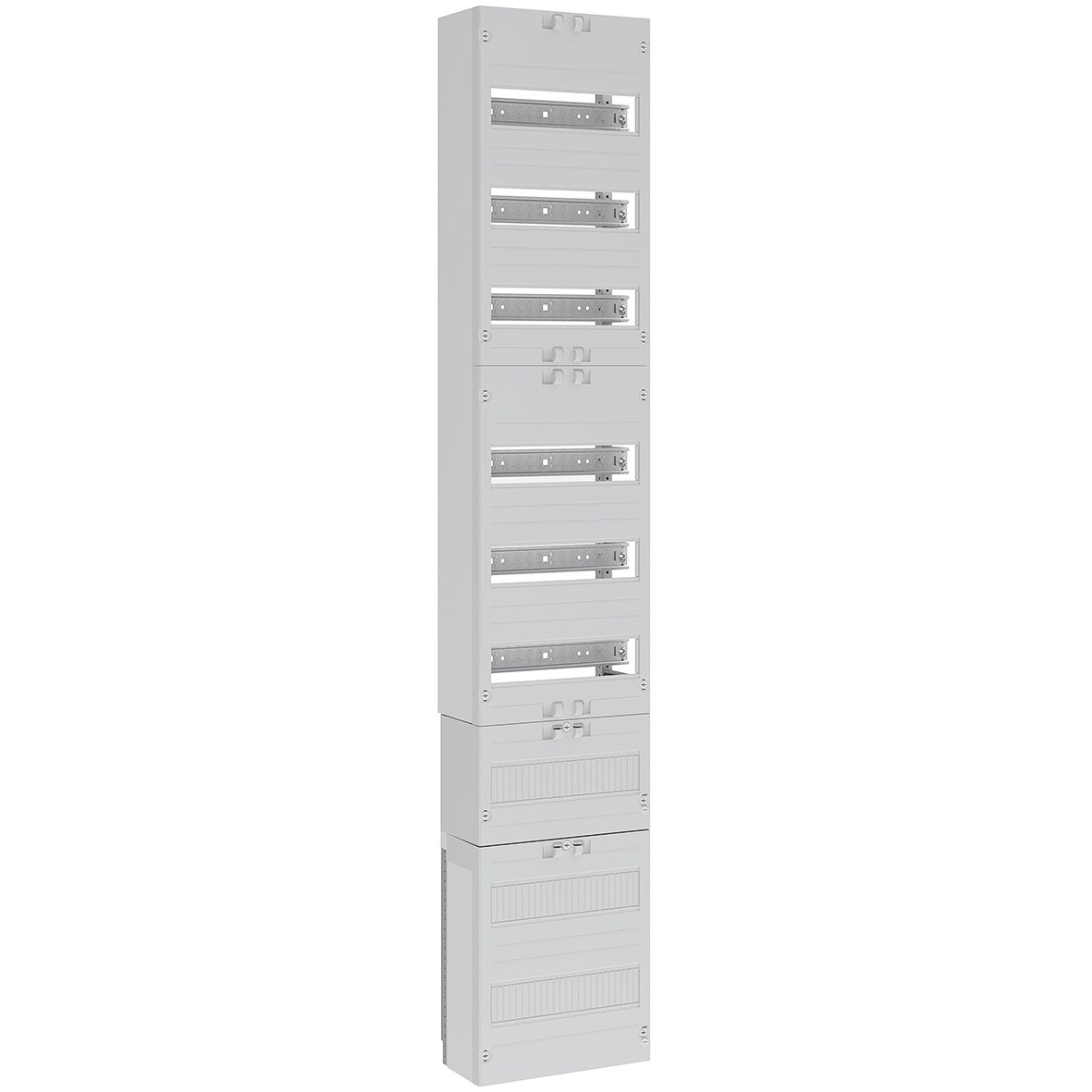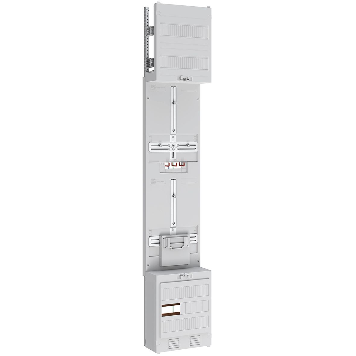 Systemgehäuse für AP-, UP- und teilversenkter Montage, bestehend aus: Leergehäuse mit flächenbündiger Leitungsmembran, seitlichen Vorprägungen für Querverdrahtung im AAR und Sammelschienenverbindung im NAR, Volltür, Abmessungen: 550x1400x210 mm, Schutzklasse II (schutzisoliert), Schutzart IP44, Stahlblech pulverbeschichtet, 216 Teilungseinheiten