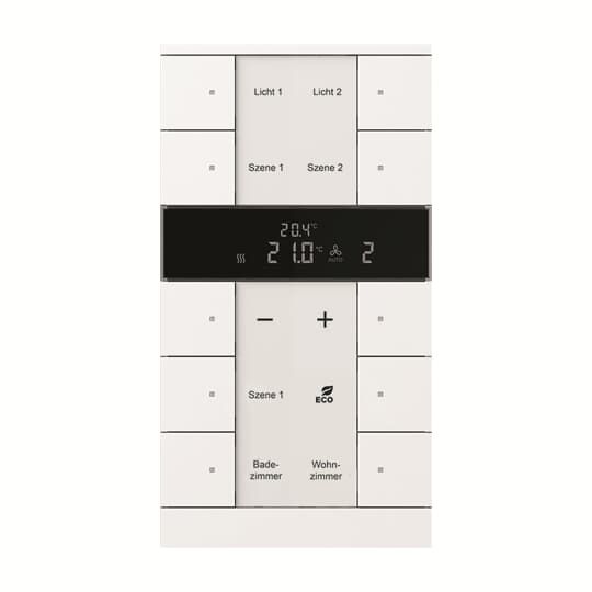 Multifunktionales HD IPS KNX-Touch-Display als Raumbedienelement zur Visualisierung und Steuerung von allen Funktionen in einer KNX Anlage. Zur Darstellung und intuitiven Bedienung von folgenden KNX-Standardfunktionen: Schalten, Wippschalter, Dimmen (4-bit und 8-bit), Schieberegler, Jalousie, RGBW Bedienelement, Raumtemperatur Bedienelement, Split Unit Bedienelement, Stufenschalter, Szenenschalter, Anzeige-Element oder Audio Bedienelement. Weitere Funktionen: 20 Stör- und Alarmmeldungen, 10 Logik Funktionen, 10 Zeitschaltuhren mit jeweils 6 Schaltzeiten, 4 Szene-Aktoren, 1 Raumtemperaturregler und einzelne Seiten können mit PIN-Code geschützt werden. Statusanzeige, Anzeige von Datum und Uhrzeit, sowie Anzeige von Innen- und Außentemperatur. Eingebauter Temperatursensor, Näherungssensor und Helligkeitssensor. Mit einem Binäreingang und externem Temperatursensor-Eingang (PT1000 / 6226/T). Das KNX-Touch-Display kann horizontal oder vertikal montiert werden. Im Hochformat (vertikal) sind bis zu 6 Bedienseiten mit insgesamt 30 Bedienelementen möglich. Im Querformat (horizontal) sind bis zu 10 Bedienseiten mit insgesamt 30 Bedienelementen möglich. Blickwinkel Display: 160° - 160°. Die Unterputz- und/oder Hohlwandmontage erfolgt über die separate Unterputz-Montagedose BOX/U5.11. Erfordert zusätzliche Spannungsversorgung 24VDC z.B. 6358-101. Stromaufnahme: 250 mA. Display-Größe: 12,7 cm (5''). Aufbauhöhe: 11 mm. Zusatzsoftware DCA erforderlich. Designlinie: Busch-RoomTouch