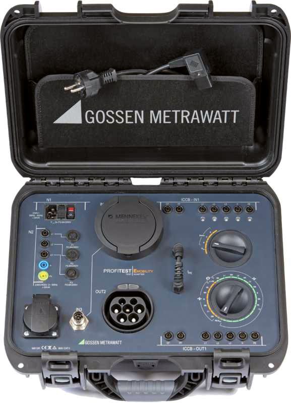Prüfadapter für E-Ladepunkte (1-/3-phasig, Typ 2) für PROFITEST mit Schutzkontakt-Steckdose. 1- und 3-phasiger Prüfadapter mit Stecker Typ 2 zum Prüfen der Wirksamkeit von Schutzmaßnahmen an E-Ladepunkten mit dem Profitest Master, Simulation von fiktiv angeschlossenen Elektrofahrzeugen sowie Simulation der Strombelastbarkeit gemäß IEC 61851-1. Verlängerter CP Prüfstift auch zum Prüfen von Ladepunkten mit fest montiertem Ladekabel.. Fahrzeugsimulation (CP) Fahrzeugzustände A bis E werden über Drehschalter eingestellt Kabelsimulation (PP) Die verschiedenen Codierungen für Ladekabel mit 13, 20, 32 und 63 A sowie kein Kabel angeschlossen können über Drehschalter simuliert werden Fehlersimulation Simulation eines Kurzschlusses zwischen CP und PE über Drehschalter Anzeige der Phasenspannungen über LEDs je nach E-Ladestation können eine oder drei Phasen aktiv sein Prüfen von E-Ladestationen mit fest angeschlossenem Ladekabel durch verlängerten CP-Prüfstift Zur Fahrzeugsimulation (CP): Gemäß IEC 61851 können die Zustände A, B, C und E simuliert werden. Die verschiedenen Fahrzeugzustände werden über den Drehschalter eingestellt. Zustand A - kein Fahrzeug angeschlossen Zustand B - Fahrzeug angeschlossen, aber nicht bereit zum Laden Zustand C - Fahrzeug angeschlossen und bereit zum Laden, Belüftung des Ladebereichs nicht gefordert Zustand E - Fehler: Kurzschluss CP-PE über interne Diode Zur Kabelsimulation (PP): Es können die verschiedenen Codierungen für Ladekabel mit 13, 20, 32 und 63 A simuliert werden. Außerdem ist es möglich, den Zustand kein Kabel zu simulieren. Die Simulation der verschiedenen Ladekabel erfolgt durch Schalten verschiedener Widerstände zwischen PP und PE mithilfe des Drehschalters. Gemäß IEC 61851 sind folgende Werte möglich: 13 A Kabel - 1,5 k? 20 A Kabel - 680 ? 32 A Kabel - 220 ? 63 A Kabel - 100 ? . Zusätzlich mit Schutzkontakt-Steckdose. 1 Prüfadapter