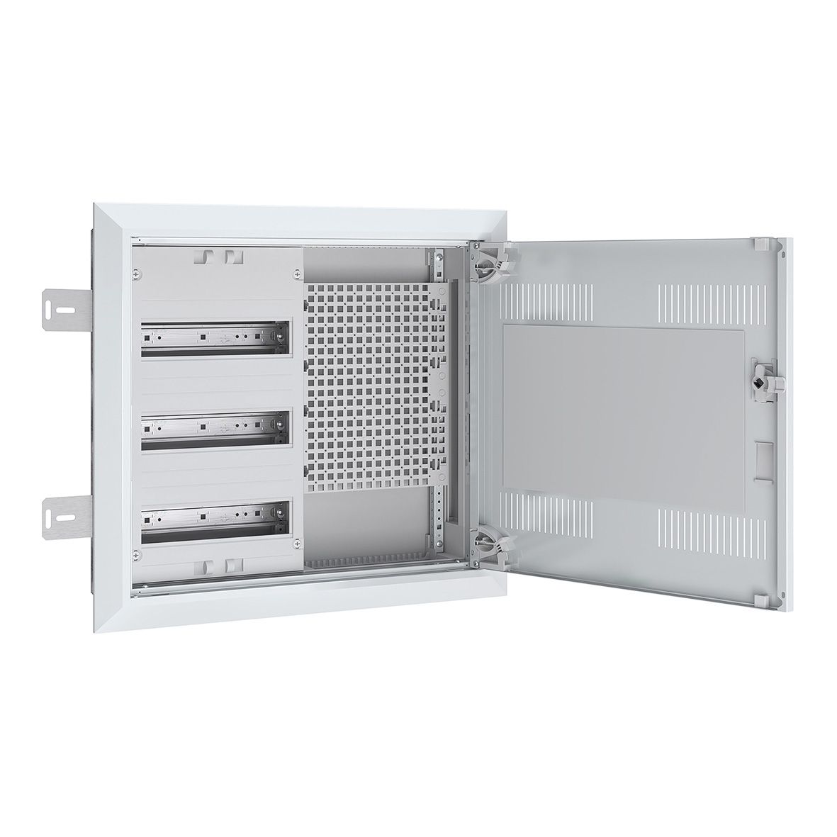 Komplettschrank für Unterputz- und Hohlwand- Montage bestehend aus: Blendrahmen inkl. Mediatür (Tür mit Lüftungsschlitzen und Kunststoffeinsatz für WLAN), 1x Verteilerfeld 5-reihig, 1x Multimediafeld LexCom Home bestehend aus: 4x vollflächige Multimedia-Montagefläche zur Aufnahme von LexCom Zubehör in Steck- und Schraubtechnik, IP30