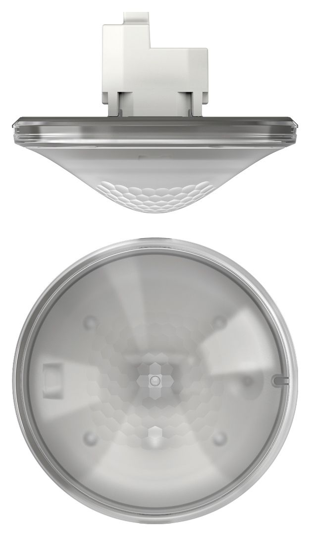 KNX-Präsenzmelder für Deckenmontage, Zwei Kanäle Licht zur Steuerung von zwei Lichtgruppen, Schalten oder Konstantlichtregelung, Betrieb als Voll-oder Halbautomat umschaltbar, Kanal Helligkeit mit zyklischer Ausgabe, Kanal für Raum-Überwachung, Verkürzung der Nachlaufzeit Licht bei kurzer Anwesenheit, Mischlichtmessung, Quadratischer Erfassungsbereich, Licht-Ausschaltverzögerung selbstlernend, Umschaltung zwischen 2 Helligkeits-Sollwerten, Helligkeits-Sollwerte über Bus einstellbar, Stand-by Funktionalität, 2 Präsenz-Kanäle mit Einschaltverzögerung/inaktiv, Ausschaltverzögerung einstellbar, Parameter fernbedienbar und auslesbar (SendoPro 868-A), Master/Slave Betrieb wählbar, Testfunktionen, Szenensteuerung mit zwei Szenen, 8-bit Szenen, integrierter Busankoppler