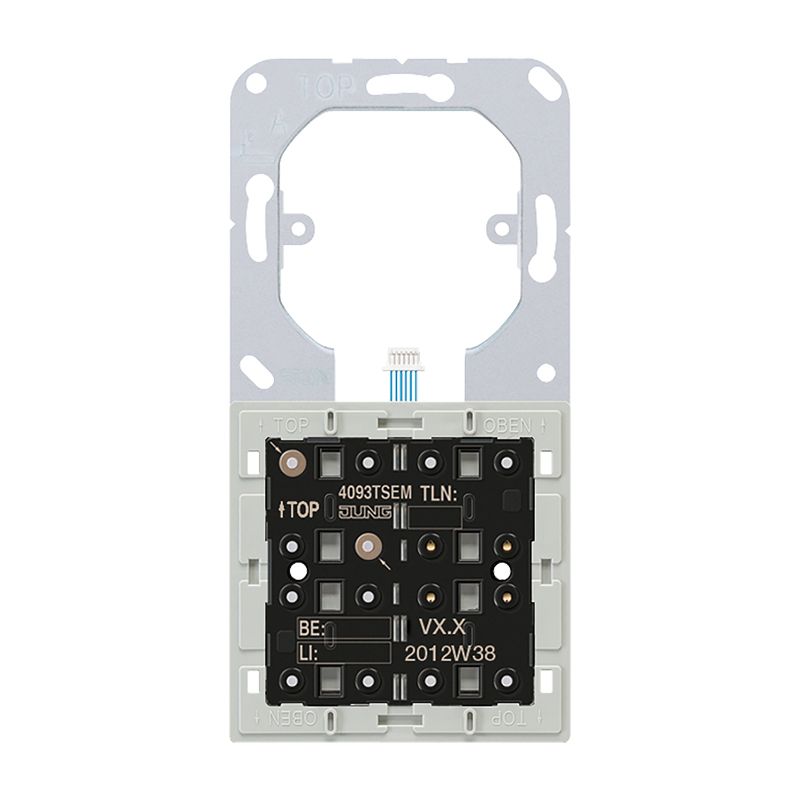 für Tastensatz 3fach, Art.-Nr.: .. 4093 TSA .. erweiterbar mit einem Tastsensor-Erweiterungsmodul Art.-Nr.: 409.. TSEM Adapterrahmen liegen bei: Art.-Nr. LS 4 AR für die Serie LS (vormontiert) und Art.-Nr. CD 4 AR für die Serie CD. Serie AS / A ohne Adapterrahmen. Bestimmungsgemäßer Gebrauch Messen und Regeln der Raumtemperatur Bedienen von Verbrauchern, z.B. Licht ein/aus, Dimmen, Jalousien auf/ab, Helligkeitswerte, Temperaturen, Abrufen und Abspeichern von Lichtszenen etc. Montage in Gerätedose mit Abmessungen nach DIN 49073 Produkteigenschaften Alle Tasten können mit Tastsensorfunktionen oder Funktionen für die Reglerbedienung belegt werden. KNX Medium: TP 256 Vier rote Status-LEDs Eine blaue Betriebs-LED als Orientierungslicht sowie zur Anzeige des Programmierzustands Integrierter Busankoppler Anschluss für ein Tastsensor-Erweiterungsmodul 1-4fach Integrierter Temperaturfühler Raumtemperaturregelung mit Sollwertvorgabe Anzeige von Raum- oder Soll-Temperatur Anzeige der Außentemperatur mit externem Sensor, z.B. Wetterstation Anzeige von Uhrzeit, in Verbindung mit KNX-Zeitgeber Tastsensor-Funktionen Schalten, Dimmen, Jalousiesteuerung, Wertgeber, Szenenaufruf etc. Tastenfunktion oder Wippenfunktion, vertikal oder horizontal Lüftersteuerung mit bis zu 8