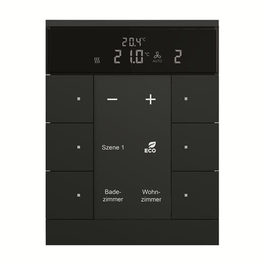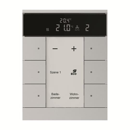 Frei konfigurierbares Multifunktionsbedienelement. Mit integriertem KNX-Busankoppler. Mit Beschriftungsfeld. Unterstützung der KNX-Funktionen durch innovatives Farbkonzept (gelb=Beleuchtung, blau=Jalousie, orange=RTR, magenta=Szene und weiß=neutral/keine Funktionszuordnung) oder Standardbeleuchtung rot/grün. Tasterfunktion: Schalten / Dimmen / Jalousie /Wert senden / Lichtszenen u.a. Zur Ansteuerung von Heizungs-, Lüftungs- und FanCoil-Aktoren. Master-/Slavebetrieb. Mit Grundlastbetrieb. Die Lüfterstufe kann manuell oder in den Automatikbetrieb geschaltet werden. Klasse des Temperaturreglers:1 Beitrag zur Raumheizungsenergieeffizienz: 1,0%. Anzahl Busteilnehmer: 1. Designlinie: Busch-Tenton Produktreihe: KNX