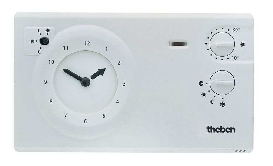 Elektronischer Raumtemperaturregler mit automatischer Nachtabsenkung, umstellbar für Tages-und Wochenprogramm, programmierbar alle 5 Min. bzw. 30 Min., kürzeste Schaltzeit für Wochenprogramm 2 Std., Tag-und Nachttemperatur einstellbar von +10°C ... 30°C, Betriebsarten Wahlschalter, Frostschutz 6°C, Partyschalter, Kontrollanzeige, thermische Rückführung und Arbeitspunkt einstellbar. Anschluss für Telefonfernschalter, Gangreserve 3 Tage, Gehäusefarbe weiß, 1 Wechsler