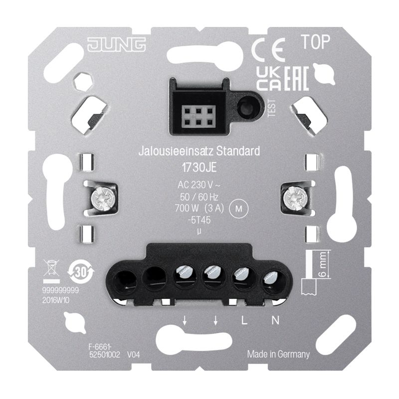 mit Fühleranschluss für Aufsätze JUNG HOME Art.-Nrn.: BT .. 1791 .. für Aufsätze LB-Management Art.-Nrn.: .. 1790 D .. für Aufsätze KNX RF Art.-Nrn.: .. 1091 1ST RF .., .. 1092 1ST RF .. Bestimmungsgemäßer Gebrauch Schalten von elektrischen Fußbodenheizungen und elektrothermischen Stellantrieben Betrieb mit geeignetem Aufsatz Montage in Gerätedose mit Abmessungen nach DIN 49073 Produkteigenschaften Pulsweitenmodulation (PWM) oder Zweipunktregelung (Ein/Aus) Fernfühler (Art.-Nr.: FF NTC) anschließbar Fernfühler von verschiedenen Herstellern anschließbar (ab Version V03) Eingang zum Umschalten auf Kühlbetrieb Unterbricht nach 60 Minuten den Heizvorgang (Überhitzungsschutz eines Heizgerätes) Nennspannung: AC 230 V ~ Netzfrequenz: 50/60 Hz Standby-Leistung abhängig vom Aufsatz: ca. 0,1 ... 0,5 W Schaltstrom 230 V AC1: 10 mA ... 16 A Anschlussleistung: max. 3.600 W Anschluss eindrähtig: 1 x 0,5 ... 4,0 mm2 2 x 0,5 ... 2,5 mm2 feindrähtig ohne Aderendhülse: 1 x 0,5 ... 4,0 mm2 2 x 0,5 ... 2,5 mm2 feindrähtig mit Aderendhülse: 1 x 0,5 ... 4,0 mm22 x 0,5 ... 1,5 mm2 Anzahl Stellantriebe: 1 ...