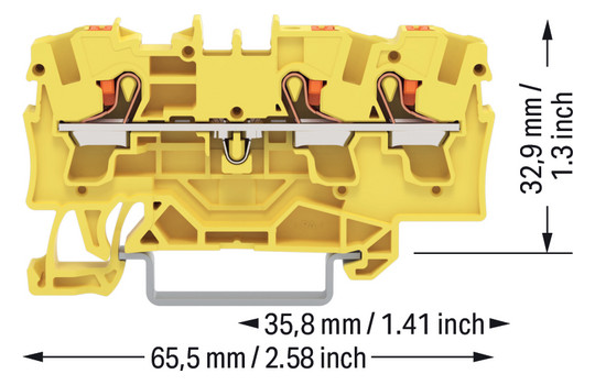 3-Leiter-Durchgangsklemme: mit Drücker: 4 mm²: mit Prüföffnung: für Anwendungen Ex e II geeignet: seitliche und mittige Beschriftung: für Tragschiene 35 x 15 und 35 x 7,5: Push-in CAGE CLAMP : 4,00 mm²: gelb