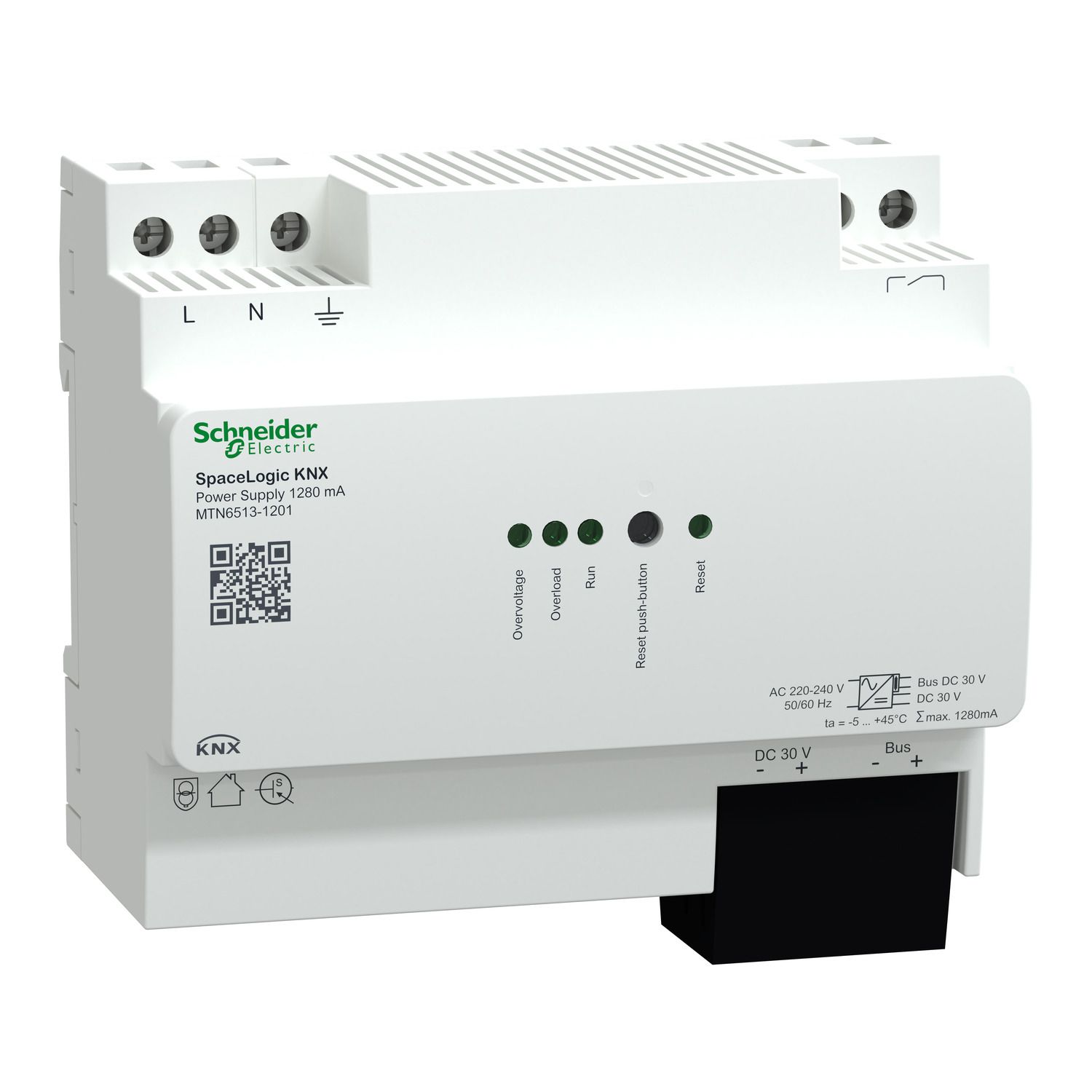 KNX Spannungsversorgung 640mA, REGSpaceLogic KNX Spannungsversorgung 640mAbestimmungsgemäßer Gebrauch-Versorgung von KNX-Geräten mit Busspannung-Versorgung von Geräten mit Gleichspannung-Zur Montage auf DIN-Schienen TH35 nach EN 60715. Der Bus wird über eine Busanschlussklemme angeschlossen. Die SpaceLogic KNX-Stromversorgung erzeugt die Busspannung für die KNX Linie. Die Stromversorgung hat zwei Ausgänge-einen KNX-Ausgang mit integrierter Drossel und einen -DC 30 V-Ausgang für zusätzliche Geräte.Zwei identische Spannungsversorgungen können parallel geschaltet werden, um den Ausgangsstrom zu verdoppeln. Die Spannungsversorgung verfügt über einen potentialfreien Meldekontakt für Betriebs-und Diagnosemeldungen.Merkmale: -Der Nennstrom kann beliebig verteilt werden. Reset-Taste zum Abschalten der Stromversorgung und zum Zurücksetzen der Busgeräte. Kurzschlussfest-Überspannungsfest -Leerlauffest -Für den Betrieb in Anlagen mit Notstromversorgung. Technische Daten:Nennspannung: 220-240 V ACNetzfrequenz: 50/60 HzVerlustleistung: max. 1,8 WKNX Medium: TP256Bus-Ausgangsspannung: 28-31 V DC SELVBus-Ausgangsstrom: 640 mA (alle Ausgänge)DC 30 V. Gerätebreite: 4 TE (72 mm)Zum Inhalt: Mit Busanschlussklemme