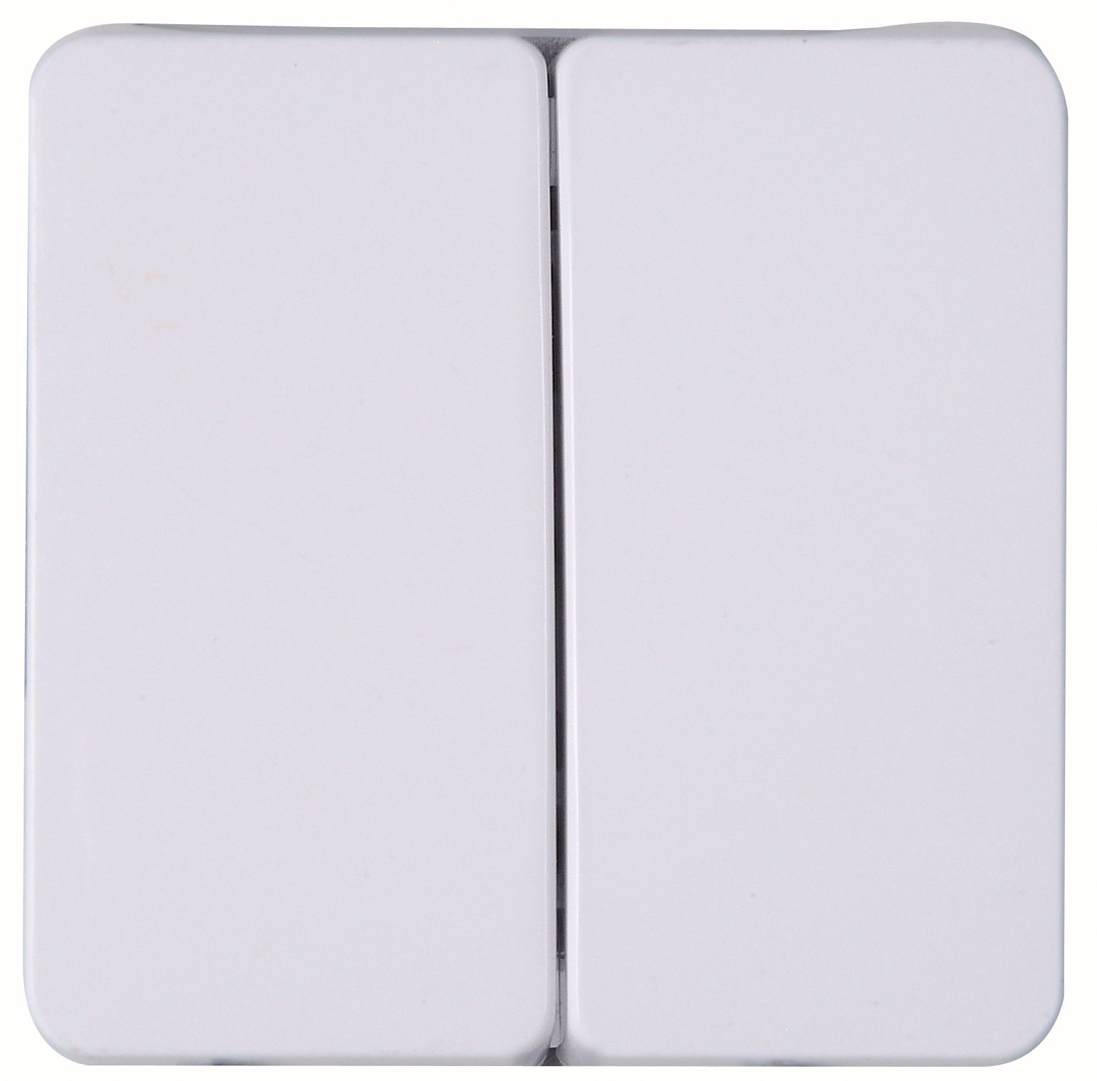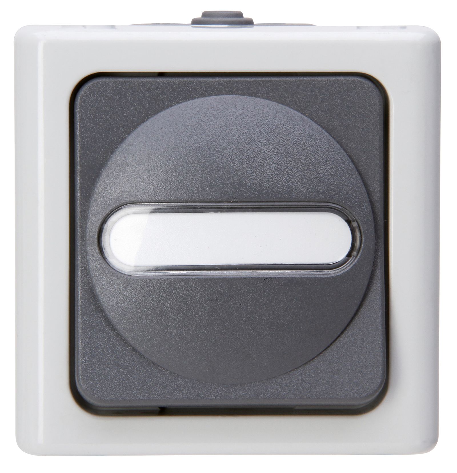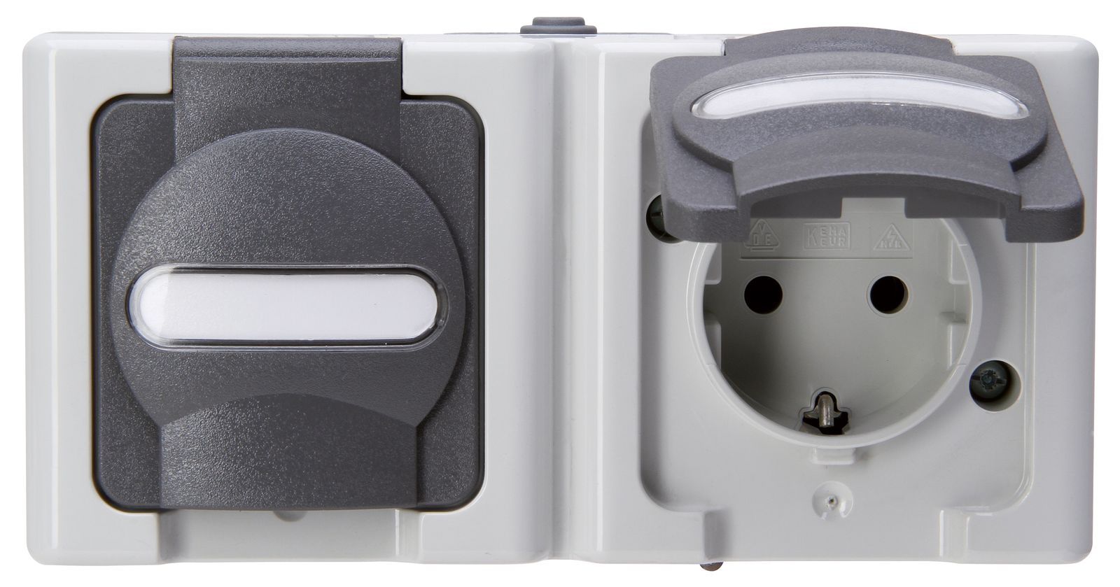 BLUE ELECTRIC - Aufputz-Feuchtraum, Universalschalter (Aus/Wechselschalter) und beleuchtete Schutzkontakt-Steckdosenkombination, beide Geräte mit Beschriftungsfeld, senkrecht, 10AX/16A, 250V~, Schutzart IP44, Farbe: grau
