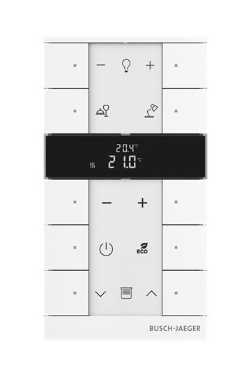 Busch-Tenton , Raumtemperaturregler mit Bedienfunktion 12-fach. Mit integriertem free@home Busanschluss. Mit Beschriftungsfeld. Tasterfunktion: Schalten / Dimmen / Jalousie /Wert senden / Lichtszenen u.a. Bedienelemente: Tastkontakte links/rechts. LED zur Anzeige des Schaltzustandes oder als Orientierungslicht. Mit integriertem Raumtemperaturregler und Temperaturfühler. Der Raumtemperaturregler kann als Haupt- oder /Nebenstellenbetrieb genutzt werden. Die Bedienung des Raumtemperaturreglers erfolgt ausschliesslich per App oder Nebenstelle. Spannungsversorgung über Bus-Klemmen (a,b). Designlinie: Busch-Tenton Produktreihe: Busch-free@home
