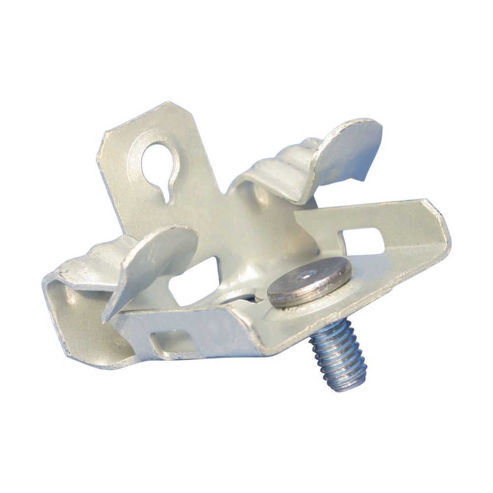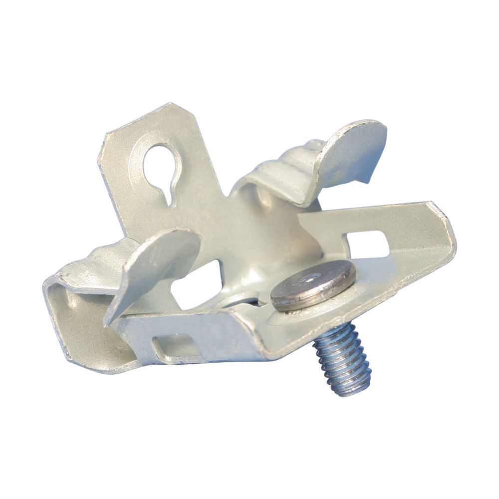 Befestigungselement zum Aufschlagen, zur Gewindestiftbefestigung von Gerätedosen, Vorrichtungen u. anderen Anwendungen an Trägerflanschen. Federstahlbefest., wird an Flanschen von 21 bis 28mm befestigt, mit M6 x 11mm Gewindestift.