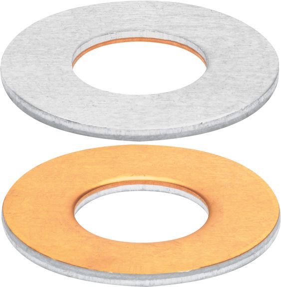Unterlegscheibe bei der Verarbeitung von Aluminium- und Kupferkabelschuhen. Galvanische Trennung zwischen Kupfer und Aluminium. Verarbeitung nur in trockener Umgebung. Werkstoff E-Al, einseitig mit Cu plattiert. M12